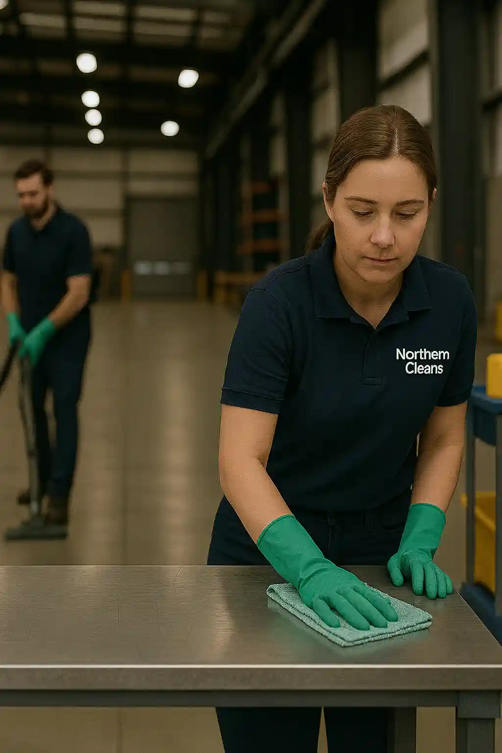Specialist industrial cleaning for factories, warehouses, and manufacturing facilities. Health & Safety compliant services with trained professionals across Manchester and the North West.